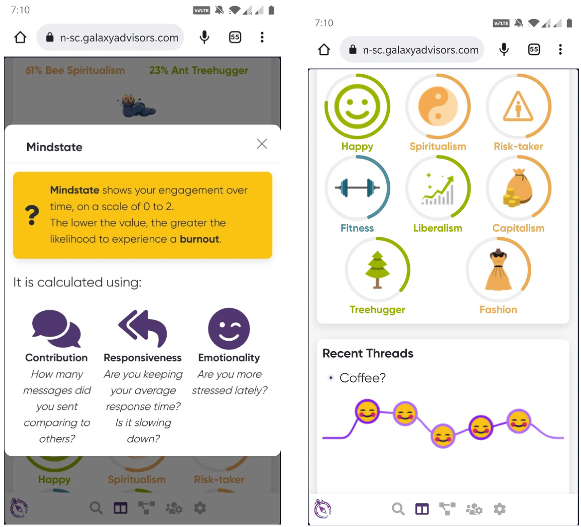 The Social Compass will also tell you your state of mind, are you currently happy or stressed. In addition it will tell you your tribes, are you a nerd, a fatherlander, a treehugger, or a spiritualist. This is all done based on the words you are using, which are compared anonymously and encrypted using the latest advances in AI trained with the words that tribal leaders are using (e.g. Elon Musk is a prototypical nerd). In the current version, Social Compass takes as input your emails (gmail, outlook) or teams messages, plus the messages you are receiving. We are currently working on a version that will also include your WhatsApp messages.